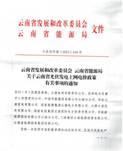 4月3日,云南省發(fā)展和改革委員會、云南省能源局發(fā)布了《關于云南省光伏發(fā)電上網(wǎng)電價政策有關事項的通知》。該政策自2023年4月1日起執(zhí)行。通知顯示,為進一步發(fā)揮市場配置資源的決定性作用,促進光伏發(fā)電產業(yè)健康有序發(fā)展,提升能源保供能力,云南省對新增合規(guī)光伏發(fā)電項目全電量納入市場統(tǒng)籌。