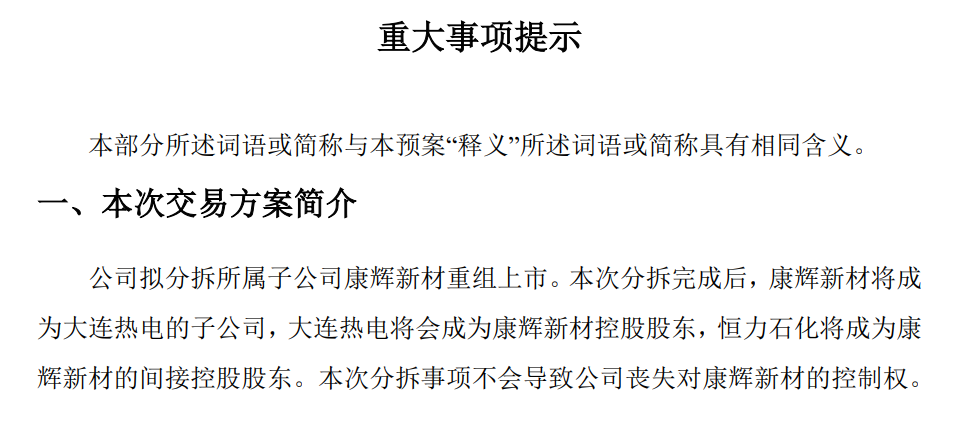 千億民營石化巨頭擬分拆康輝新材與大連熱電重組上市。7月4日,恒力石化發(fā)布公告稱,擬分拆所屬子公司康輝新材重組上市。