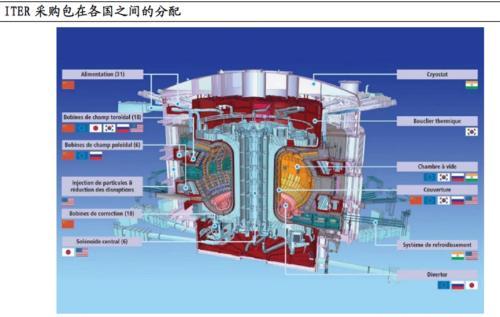 國際上,國際熱核聚變實驗堆ITER是全球在建的規(guī)模最大的可控磁約束核聚變裝置,由歐、中、俄、韓、日、美、印等7 方30 個國家聯(lián)合參與建設(shè),其中中方實物+現(xiàn)金貢獻度達9%。