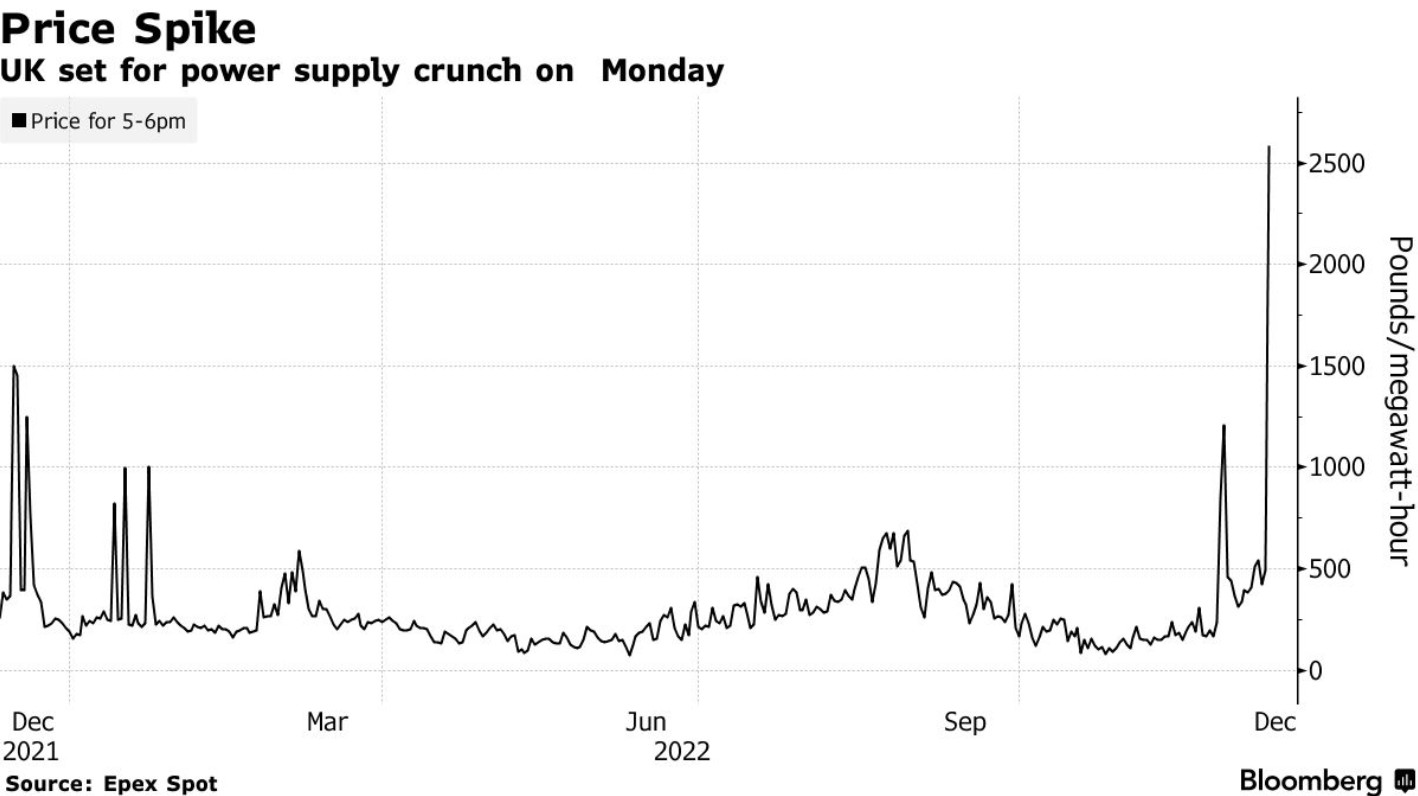 由于寒冷的氣溫將導致電力需求激增,再加上風力發(fā)電量下降導致供應(yīng)短缺,英國電力價格周一飆升至創(chuàng)紀錄水平。據(jù)數(shù)據(jù)顯示,英國電力價格日前以創(chuàng)紀錄的每兆瓦時674.78英鎊結(jié)算,而周一電力價格則創(chuàng)下每兆瓦時2585.80英鎊的歷史新高。