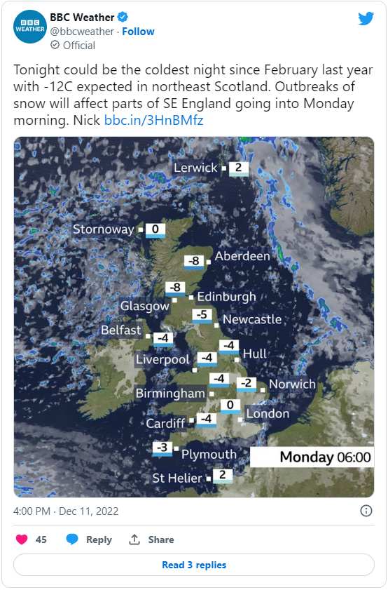 據(jù)了解,英國氣象局在上周四之前發(fā)布了黃色冰雪天氣預警,而到上周日晚上,倫敦的氣溫將降至零下3攝氏度(26.6華氏度),這將增加供暖需求。英國國家電網(wǎng)公司的數(shù)據(jù)顯示,周一下午5點的用電量預計將達到46,695兆瓦的峰值,高于周日的42,930兆瓦的峰值。
