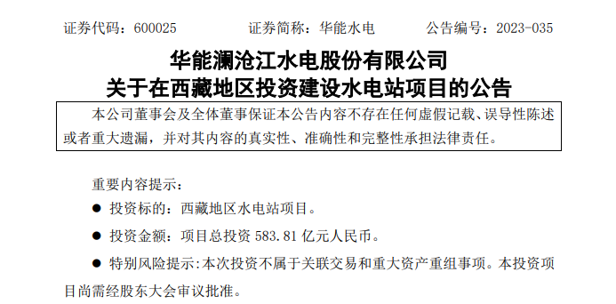 華能水電5月30日晚間公告,公司擬在西藏地區(qū)投資建設(shè)水電站項(xiàng)目,項(xiàng)目裝機(jī)容量260萬(wàn)千瓦,多年平均發(fā)電量112.81億千瓦時(shí),工程總工期132個(gè)月(不含籌建期),按2022年三季度價(jià)格水平計(jì)算,工程總投資583.81億元。