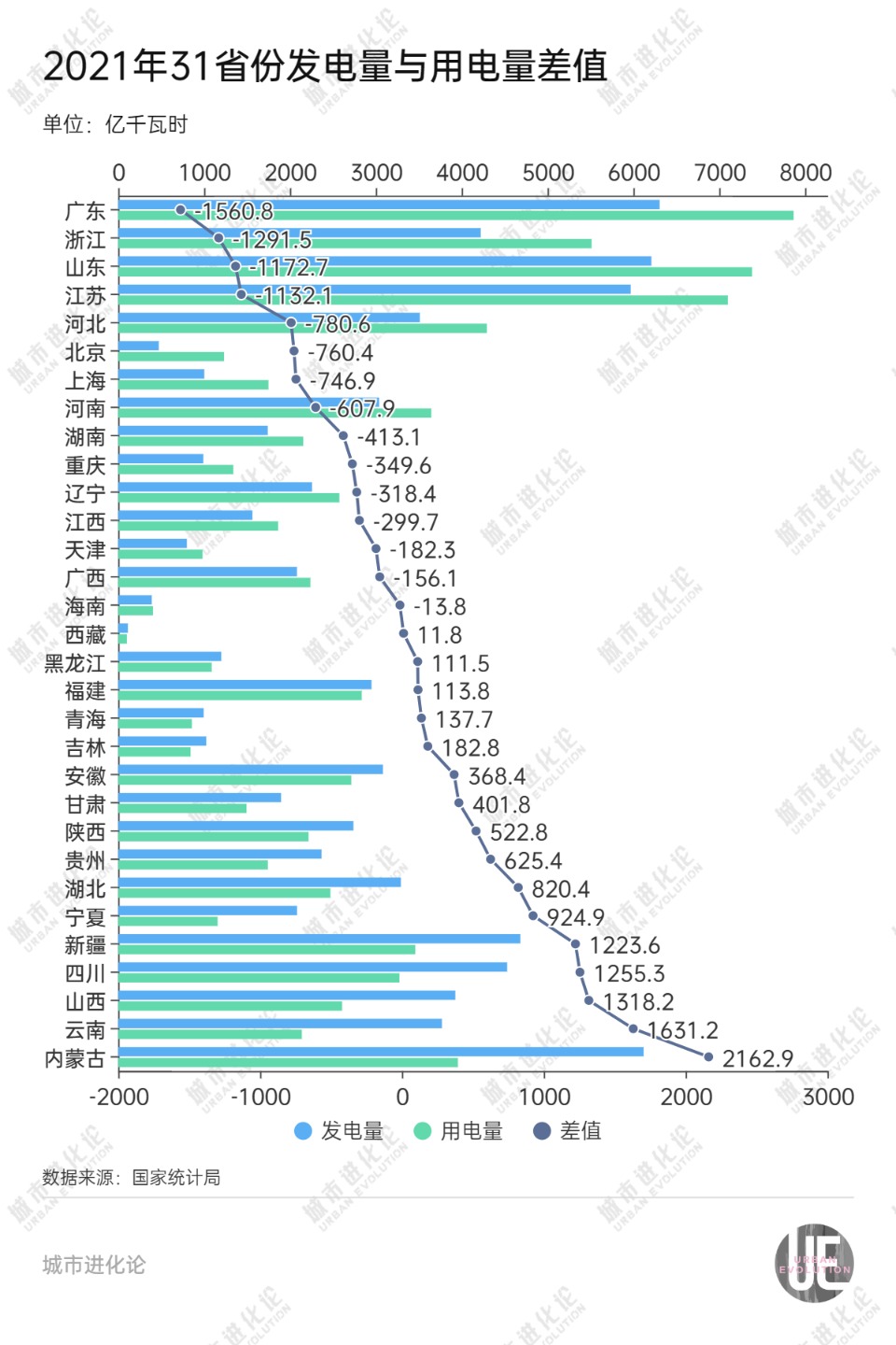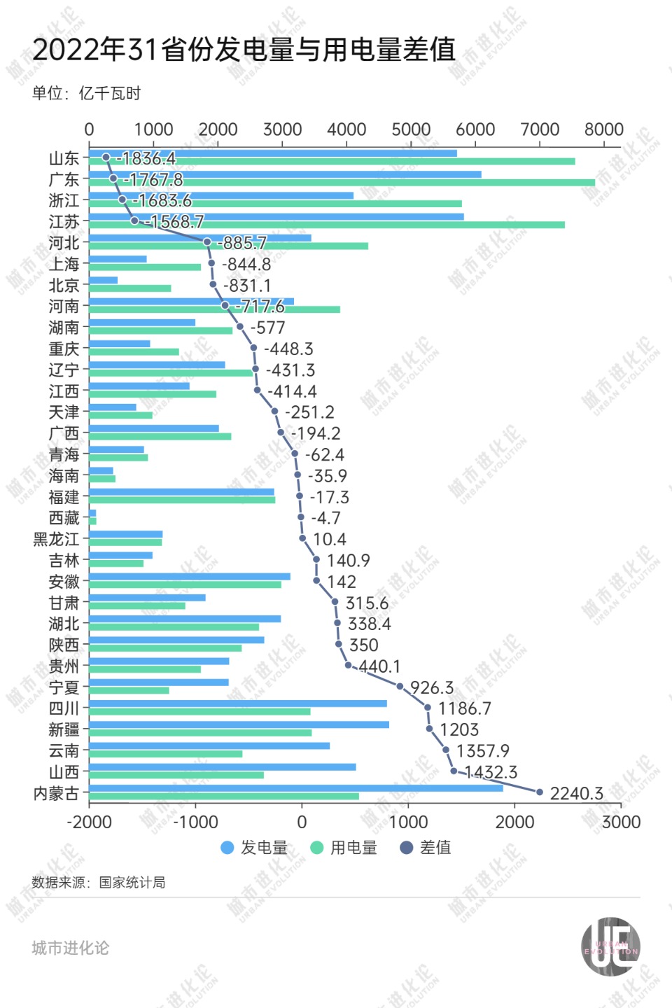 若以“發(fā)電量-用電量”來(lái)評(píng)估各省份發(fā)電凈貢獻(xiàn)和電力缺口,2022年,山東的差值為-1836.4億千瓦時(shí),凈貢獻(xiàn)從前一年全國(guó)倒數(shù)第三跌至倒數(shù)第一。