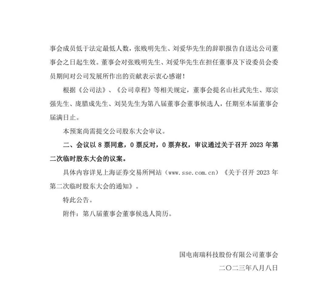 8月8日,國電南瑞科技股份有限公司發(fā)布公告稱,因工作變動,冷俊不再擔任公司第八屆董事會董事長、董事及董事會戰(zhàn)略委員會召集人等職務(wù) ,但目前仍為公司法定代表人。