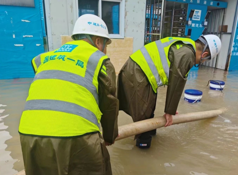 中建一局所屬在京項(xiàng)目通過壘筑防洪沙袋、運(yùn)轉(zhuǎn)大功率抽水機(jī)緊急排水、夜間組織人員通宵值班巡查等舉措,全力搶救物資,把損失降到最低,并配備防汛沙袋、塑料布以及水泵、挖機(jī)等進(jìn)行排水防汛,確保安全度過汛期。