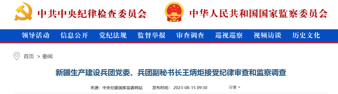 中央紀(jì)委國家監(jiān)委網(wǎng)站8月15日消息,據(jù)新疆生產(chǎn)建設(shè)兵團(tuán)紀(jì)委監(jiān)委消息:新疆生產(chǎn)建設(shè)兵團(tuán)黨委、兵團(tuán)副秘書長王炳炬涉嫌嚴(yán)重違紀(jì)違法,目前正接受新疆生產(chǎn)建設(shè)兵團(tuán)紀(jì)委監(jiān)委紀(jì)律審查和監(jiān)察調(diào)查。