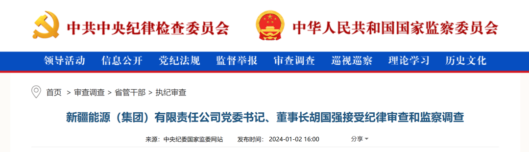據(jù)中央紀委國家監(jiān)委網(wǎng)站1月2日消息,據(jù)新疆維吾爾自治區(qū)紀委監(jiān)委消息:新疆能源(集團)有限責任公司黨委書記、董事長胡國強涉嫌嚴重違紀違法,目前正接受新疆維吾爾自治區(qū)紀委監(jiān)委紀律審查和監(jiān)察調查。