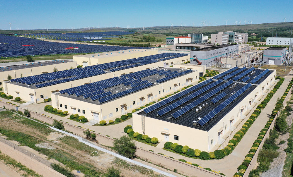 在河北張家口,國家風(fēng)光儲輸示范工程內(nèi)數(shù)排儲能廠房并列其中。(2023年8月18日攝,無人機照片)。