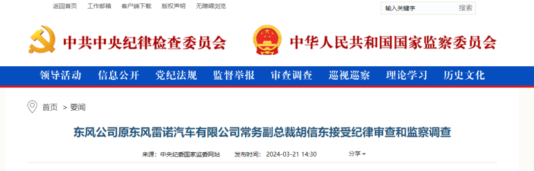 中央紀委國家監(jiān)委網(wǎng)站3月21日,據(jù)東風(fēng)公司紀委、湖北省紀委監(jiān)委消息:東風(fēng)公司原東風(fēng)雷諾汽車有限公司常務(wù)副總裁胡信東涉嫌嚴重違紀違法,目前正在接受東風(fēng)公司紀委和湖北省襄陽市監(jiān)委紀律審查和監(jiān)察調(diào)查。