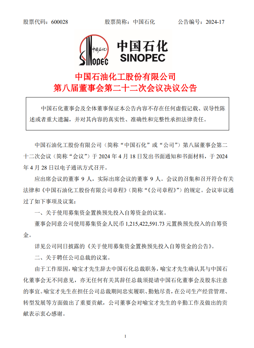 此外,按照《公司章程》的規(guī)定,根據(jù)總裁提名,董事會(huì)聘任萬(wàn)濤先生、喻寶才先生為中國(guó)石化高級(jí)副總裁,聘期自董事會(huì)批準(zhǔn)之日起至第八屆董事會(huì)任期屆滿時(shí)止。
