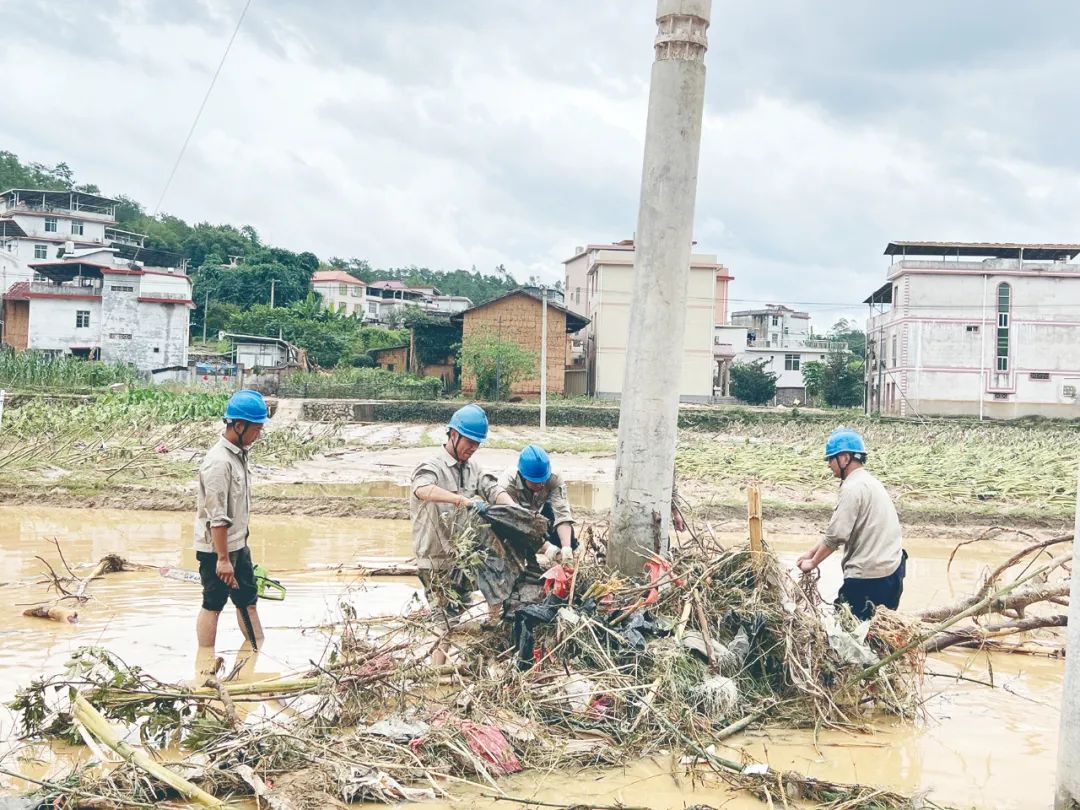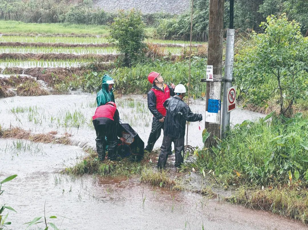 ▲圖為6月17日,國網(wǎng)福建永定區(qū)供電公司支援搶修隊(duì)伍對(duì)上杭縣10千伏稔洪線電桿傾斜現(xiàn)場開展搶修工作。黃小芬/攝