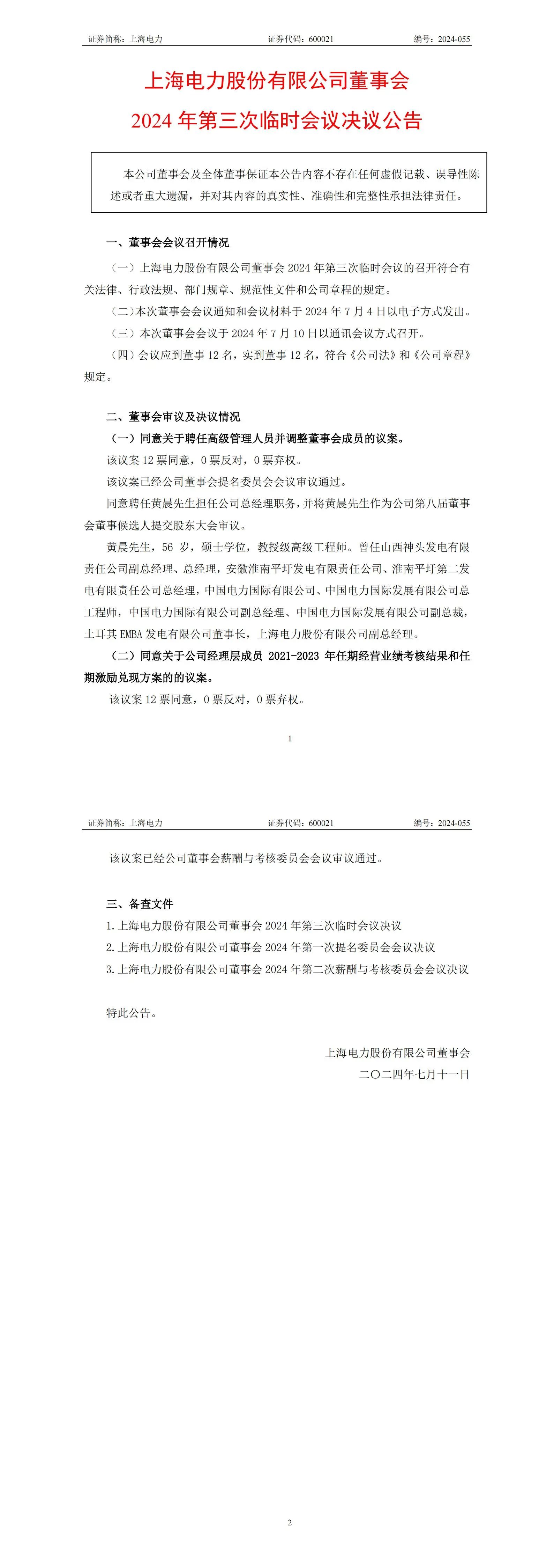 7月11日,上海電力公告,董事會(huì)同意關(guān)于聘任高級(jí)管理人員并調(diào)整董事會(huì)成員的議案,同意聘任黃晨先生擔(dān)任公司總經(jīng)理職務(wù),并將黃晨先生作為公司第八屆董事會(huì)董事候選人提交股東大會(huì)審議。