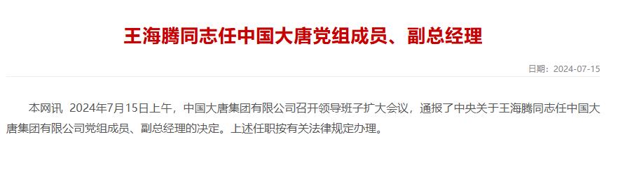 據(jù)大唐集團官網(wǎng)消息,2024年7月15日上午,中國大唐集團有限公司召開領導班子擴大會議,通報了中央關于王海騰同志任中國大唐集團有限公司黨組成員、副總經理的決定。上述任職按有關法律規(guī)定辦理。