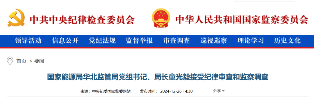 中央紀(jì)委國家監(jiān)委網(wǎng)站12月26日消息,據(jù)中央紀(jì)委國家監(jiān)委駐國家發(fā)展改革委紀(jì)檢監(jiān)察組、內(nèi)蒙古自治區(qū)紀(jì)委監(jiān)委消息:國家能源局華北監(jiān)管局黨組書記、局長童光毅涉嫌嚴(yán)重違紀(jì)違法,目前正接受中央紀(jì)委國家監(jiān)委駐國家發(fā)展改革委紀(jì)檢監(jiān)察組紀(jì)律審查和內(nèi)蒙古自治區(qū)包頭市監(jiān)察委員會監(jiān)察調(diào)查。