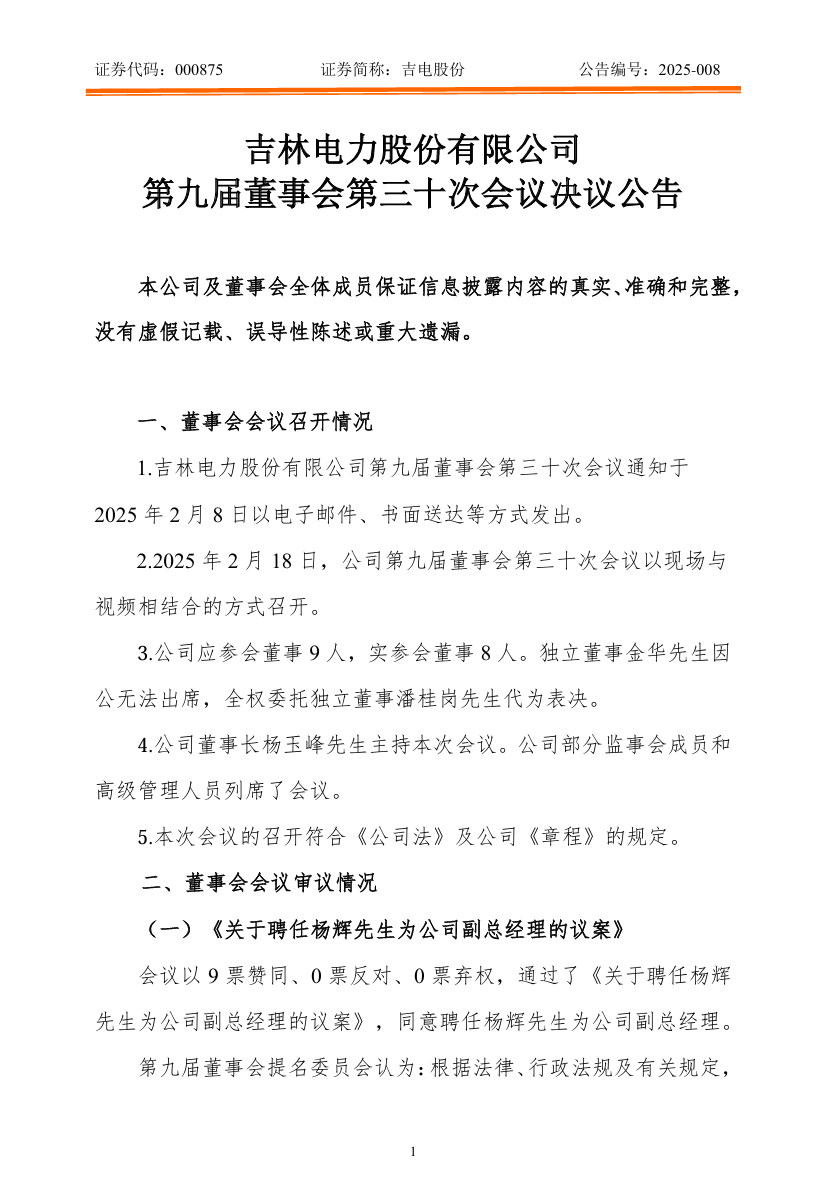 2月18日,吉電股份發(fā)布公告稱,公司第九屆董事會(huì)第三十次會(huì)議審議通過了《關(guān)于聘任楊輝先生為公司副總經(jīng)理的議案》,同意聘任楊輝先生為公司副總經(jīng)理。