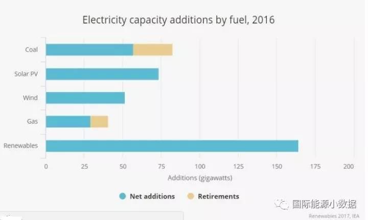 國際能源署發(fā)布2017年可再生能源報(bào)告,確認(rèn)2016年全球新增可再生能源裝機(jī)165吉瓦,其中太陽能光伏裝機(jī)達(dá)到74吉瓦(約46%來自中國),首次超過煤電新增裝機(jī)(57吉瓦)。