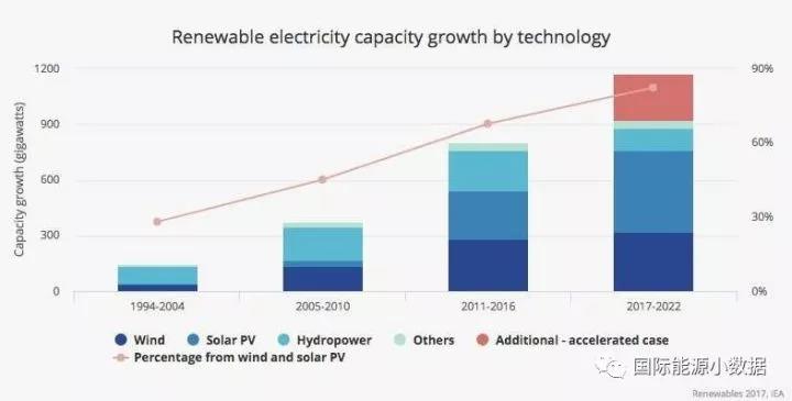 過去對(duì)于可再生能源發(fā)展規(guī)模預(yù)測(cè)曾經(jīng)偏保守的IEA現(xiàn)在預(yù)測(cè),2017-2022年間全球可再生能源新增裝機(jī)將至少達(dá)到920吉瓦(其中風(fēng)電321吉瓦、光伏438吉瓦),其中363吉瓦(39%)將來自中國。如果各國政策支持力度加大的樂觀情形下,2017-2022年間可再生能源新增裝機(jī)可能達(dá)到1150吉瓦,其中464吉瓦(40%)來自中國。
