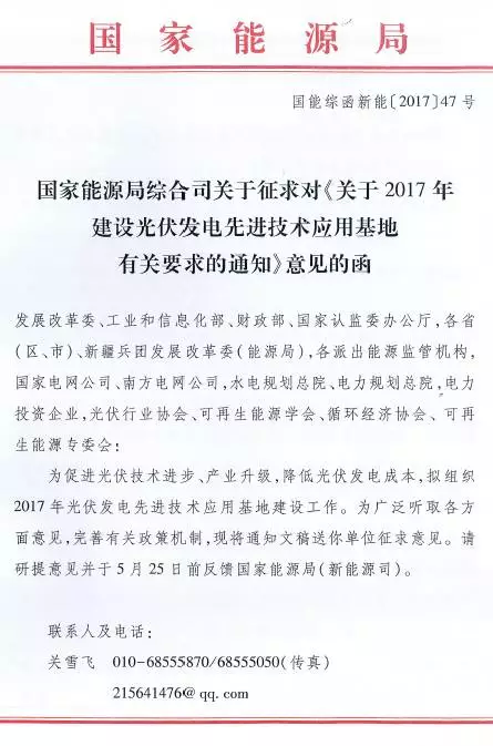 以下為《關(guān)于2017年建設(shè)光伏發(fā)電先進(jìn)技術(shù)應(yīng)用基地有關(guān)要求的通知》(征求意見(jiàn)稿)