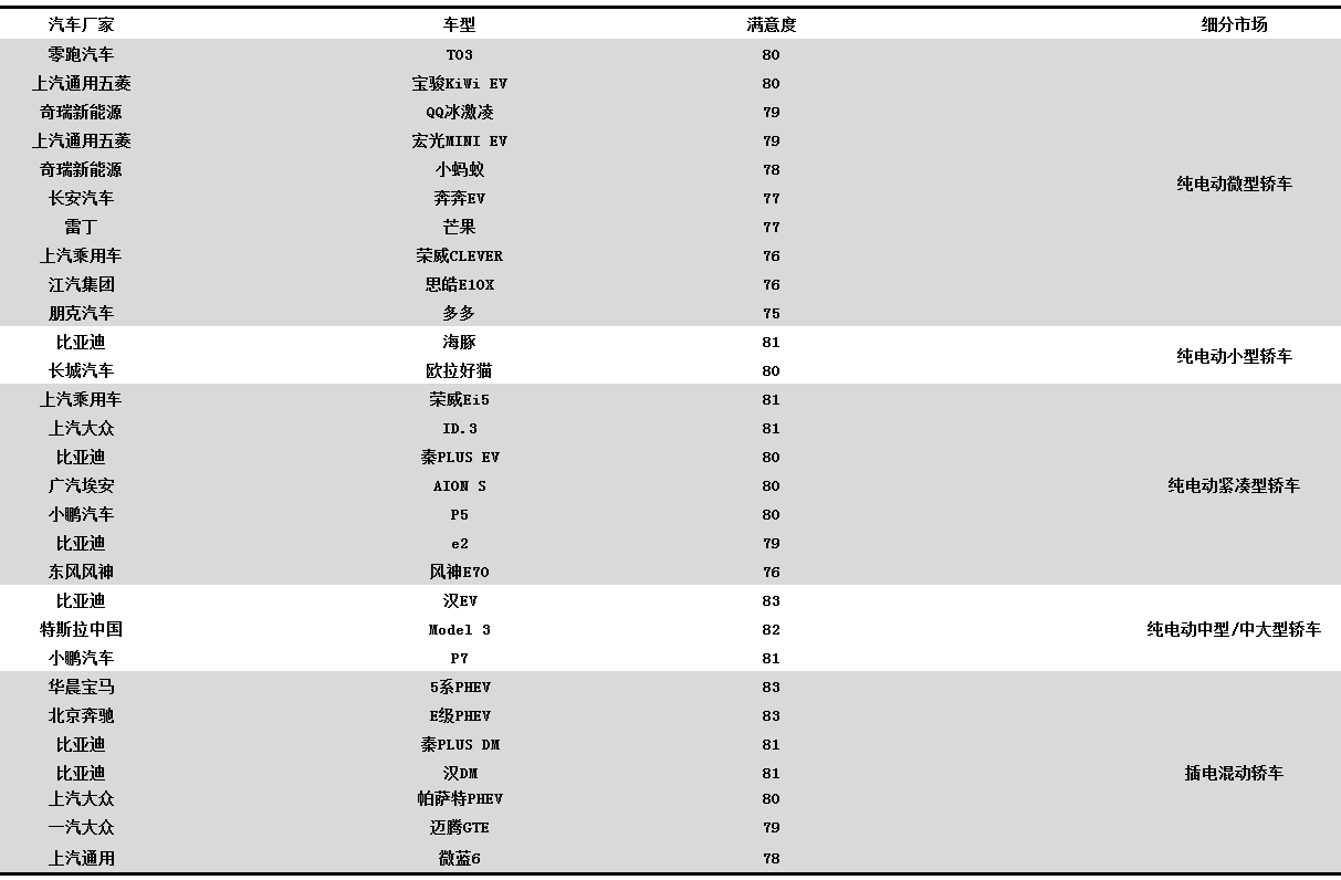 各細(xì)分市場(chǎng)新能源汽車綜合滿意度指數(shù)第一的車型分別是: