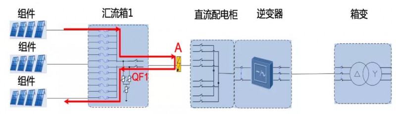 如上圖的A點發(fā)生短路故障,紅色故障回路:QF1為匯流箱斷路器,額定電流500A,由于組件的短路電流在480A左右,QF1一直不會脫扣,持續(xù)輸出直流能量到故障點,維持電弧燃燒,擴大火災事故。
