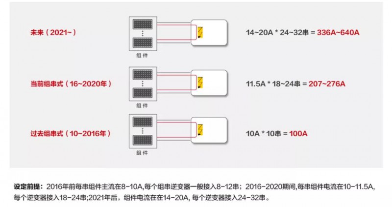 隨著硅片尺寸越來越大以及電池效率越來越高,組件電流不斷提高成為必然趨勢。我們看到,組件電流越來越大,逆變器功率或匯流箱對應的組串數量也不斷增加。