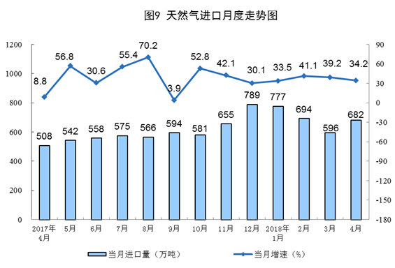 天然氣進(jìn)口連續(xù)7個(gè)月保持30%以上的高速增長。4月份,天然氣進(jìn)口682萬噸,同比增長34.2%,增速比上月回落5個(gè)百分點(diǎn)。1-4月份,進(jìn)口天然氣2742萬噸,同比增長36.4%。