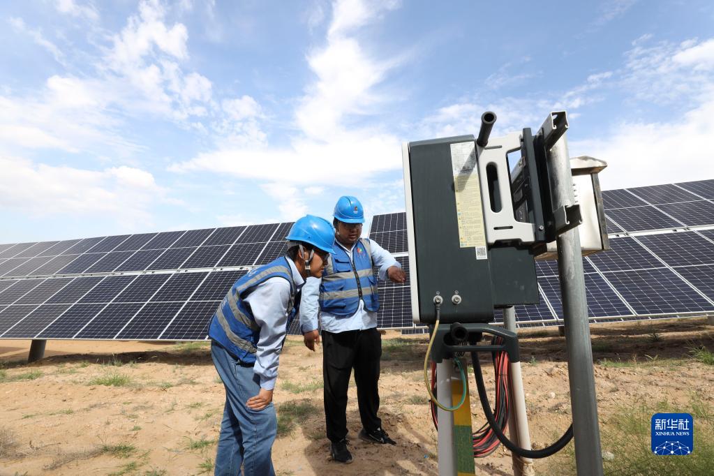 國(guó)家電投五凌電力余丁光伏電站職工在檢修設(shè)備(2022年8月31日攝)。