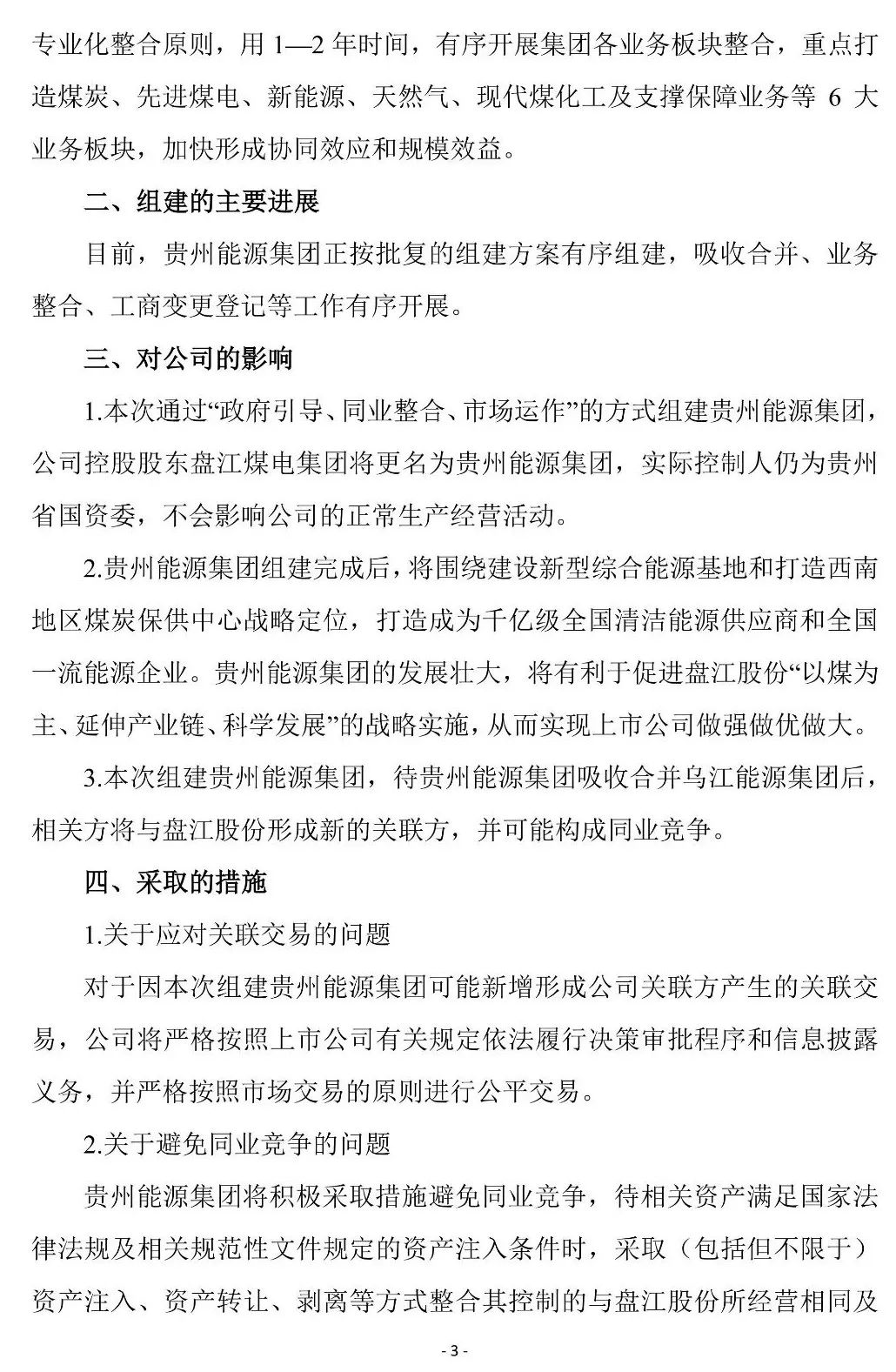 3月1日,盤江股份發(fā)布《關于控股股東更名的公告》(以下簡稱《公告》)。貴州省擬組建貴州能源集團有限公司(以下簡稱“貴州能源集團”),將盤江煤電集團更名為貴州能源集團。吸收合并貴州烏江能源集團有限責任公司(以下簡稱“烏江能源集團”)后,注銷烏江能源集團。