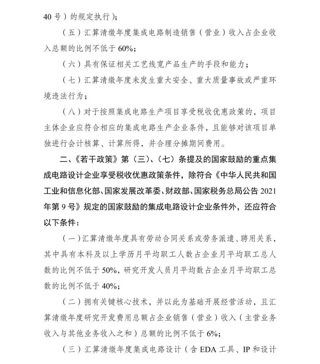 為促進(jìn)我國集成電路產(chǎn)業(yè)持續(xù)健康發(fā)展,根據(jù)《國務(wù)院關(guān)于印發(fā)新時期促進(jìn)集成電路產(chǎn)業(yè)和軟件產(chǎn)業(yè)高質(zhì)量發(fā)展若干政策的通知》(國發(fā)〔2020〕8號,以下簡稱《若干政策》)及其配套政策有關(guān)規(guī)定,經(jīng)研究,2023年享受稅收優(yōu)惠政策的集成電路企業(yè)或項目、軟件企業(yè)清單(以下簡稱“清單”)制定工作,延用2022年清單制定程序、享受稅收優(yōu)惠政策的企業(yè)條件和項目標(biāo)準(zhǔn)。現(xiàn)就有關(guān)事項通知如下: