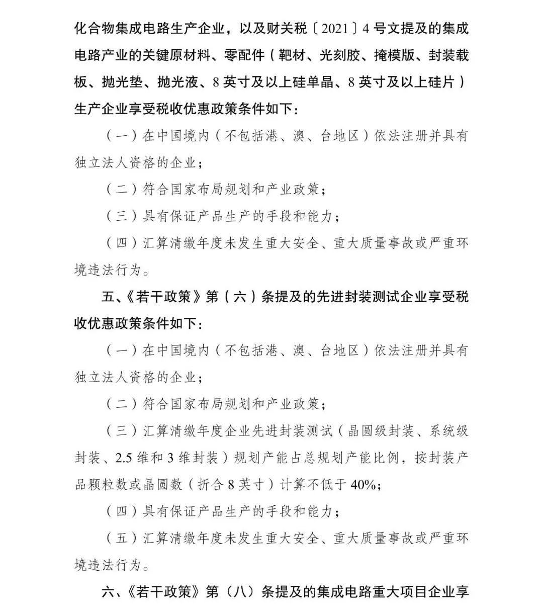 三、地方發(fā)改和工信部門根據(jù)企業(yè)條件和項目標(biāo)準(zhǔn)(附后),對企業(yè)申報的信息進(jìn)行初核通過后,報送至國家發(fā)展改革委、工業(yè)和信息化部。《若干政策》第(一)、(三)、(六)、(七)條,以及財關(guān)稅〔2021〕4號文提及的集成電路產(chǎn)業(yè)的關(guān)鍵原材料、零配件生產(chǎn)企業(yè)清單,由國家發(fā)展改革委、工業(yè)和信息化部、財政部、海關(guān)總署、稅務(wù)總局進(jìn)行聯(lián)審確認(rèn)并聯(lián)合印發(fā)?!度舾烧摺返?八)條提及的集成電路重大項目,由國家發(fā)展改革委、工業(yè)和信息化部形成清單后函告財政部,財政部會同海關(guān)總署、稅務(wù)總局最終確定。