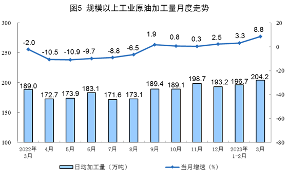 原油生產(chǎn)略有加快,進(jìn)口由降轉(zhuǎn)增。3月份,生產(chǎn)原油1818萬(wàn)噸,同比增長(zhǎng)2.4%,增速比1—2月份加快0.6個(gè)百分點(diǎn),日均產(chǎn)量58.7萬(wàn)噸。進(jìn)口原油5231萬(wàn)噸,同比增長(zhǎng)22.5%,1—2月份為下降1.3%。