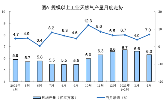 天然氣生產(chǎn)增速加快,進(jìn)口保持較快增長。4月份,生產(chǎn)天然氣189億立方米,同比增長7.0%,增速比3月份加快3.0個百分點(diǎn),日均產(chǎn)量6.3億立方米。進(jìn)口天然氣898萬噸,同比增長11.0%,增速比3月份放緩0.6個百分點(diǎn)。