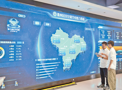 浙江省衢州市能源大數(shù)據(jù)中心,國網(wǎng)浙江衢州供電公司員工利用數(shù)字化平臺監(jiān)測全市居民空調(diào)節(jié)電情況。