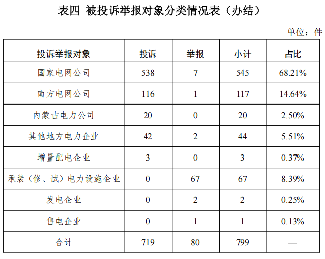 從被投訴舉報(bào)對(duì)象看,供電企業(yè)719件、占投訴舉報(bào)總數(shù)的89.99%,其中國(guó)家電網(wǎng)公司545件、占比68.21%,南方電網(wǎng)公司117件、占比14.64%,內(nèi)蒙古電力公司20件、占比2.50%,其他地方電力企業(yè)44件、占比5.51%,增量配電企業(yè)3件、占比0.37%;承裝(修、試)電力設(shè)施企業(yè)67件、占比8.39%;發(fā)電企業(yè)2件、占比0.25%;電力交易機(jī)構(gòu)1件、占比0.13%。