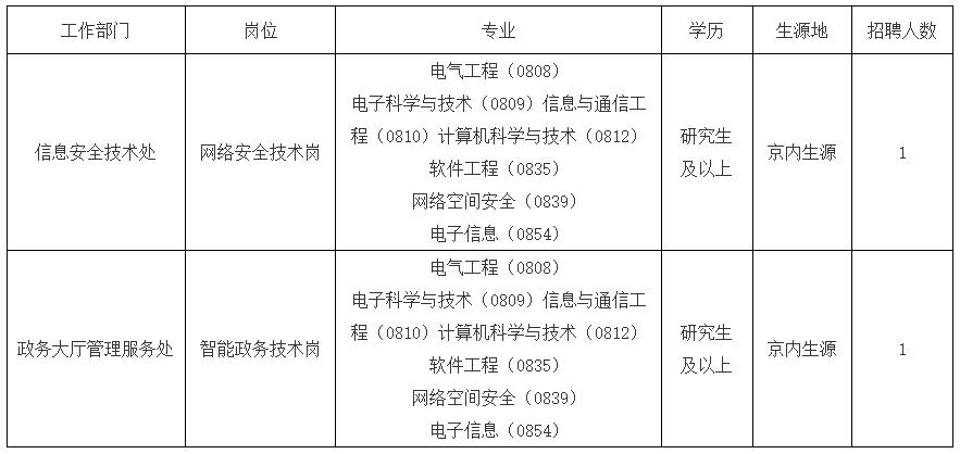2.政務(wù)大廳管理服務(wù)處:智能政務(wù)技術(shù)崗工作人員1名(京內(nèi)生源研究生及以上應(yīng)屆畢業(yè)生)。專業(yè)為電氣工程(0808)、電子科學(xué)與技術(shù)(0809)、信息與通信工程(0810)、計算機(jī)科學(xué)與技術(shù)(0812)、軟件工程(0835)、網(wǎng)絡(luò)空間安全(0839)、電子信息(0854)。要求作風(fēng)正派、嚴(yán)謹(jǐn)細(xì)致、踏實肯干,責(zé)任心強(qiáng)、執(zhí)行力強(qiáng)、服務(wù)意識強(qiáng),具有較強(qiáng)的溝通協(xié)調(diào)能力和文字功底。