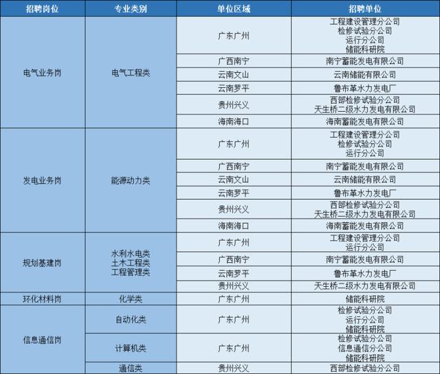 招聘單位涵蓋廣東、廣西、云南、貴州、海南五省。招聘崗位包括電氣業(yè)務(wù)崗、發(fā)電業(yè)務(wù)崗、規(guī)劃基建崗、環(huán)化材料崗、信息通信崗。具體要求如下