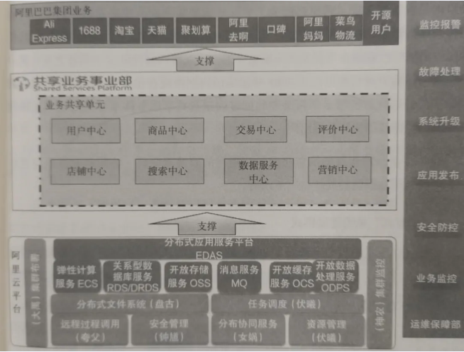 業(yè)務(wù)中臺(tái)最早是阿里集團(tuán)提出,是從淘寶、天貓系統(tǒng)中將共性的商品管理、交易管理、店鋪管理、評價(jià)管理等業(yè)務(wù)能力抽象形成業(yè)務(wù)中臺(tái),如圖所示: