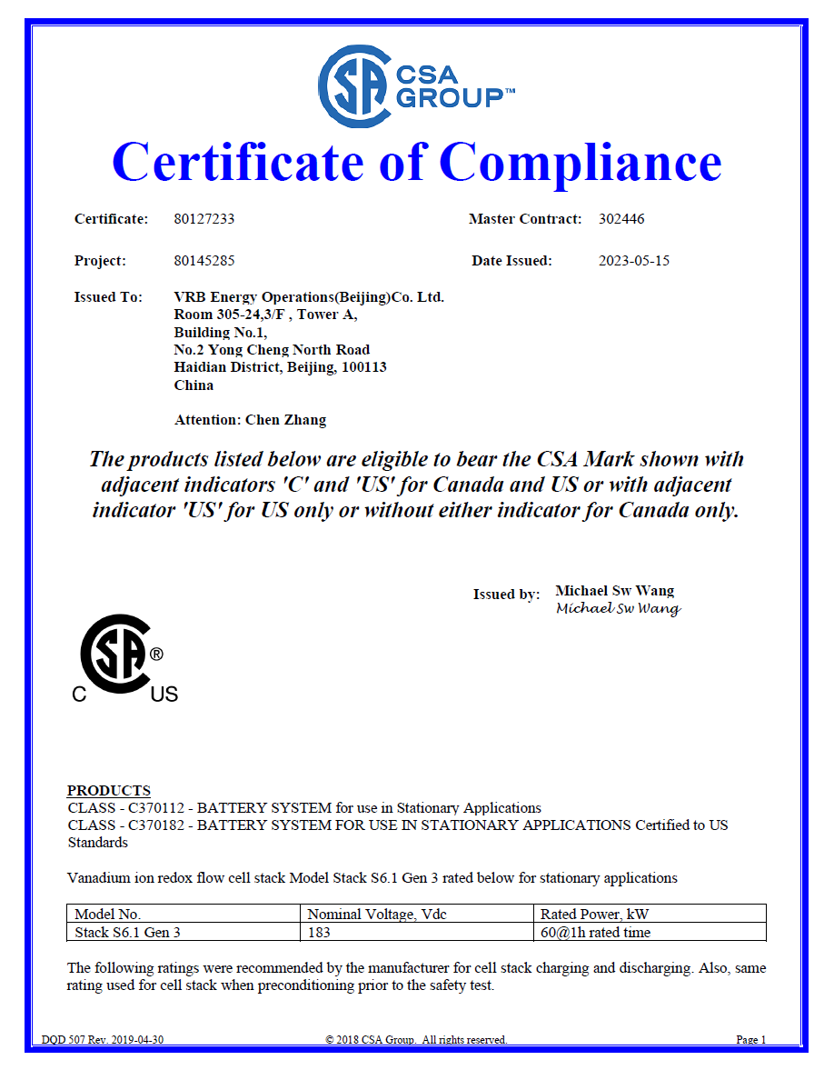 核心部件電堆UL1973認(rèn)證證書