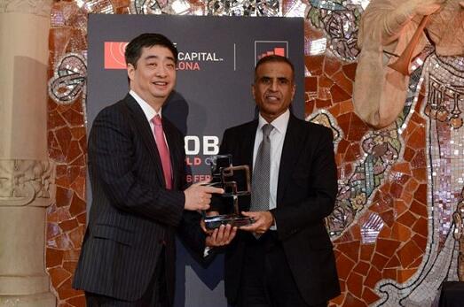 華為輪值CEO胡厚崑(左)接受GSMA主席、印度Bharti公司創(chuàng)始人兼董事長(zhǎng)Sunil Bharti Mittal(右)頒獎(jiǎng)