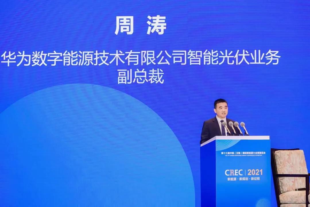 在4日下午本次大會主論壇“2021全球新能源產(chǎn)業(yè)峰會”上,華為數(shù)字能源技術(shù)有限公司智能光伏業(yè)務副總裁周濤帶來了《光儲融合,全面智能 打造面向未來的智能光儲系統(tǒng),助力構(gòu)建新型電力系統(tǒng)》的主題演講。演講以構(gòu)建新能源為主體的新型電力系統(tǒng)出發(fā),圍繞碳達峰、碳中和能源行業(yè)革命,詳細介紹了華為數(shù)字能源技術(shù)在改善電網(wǎng)和提高光伏、儲能上的產(chǎn)品和技術(shù)應用,展現(xiàn)了華為智能光伏解決方案的創(chuàng)新和引領作用。