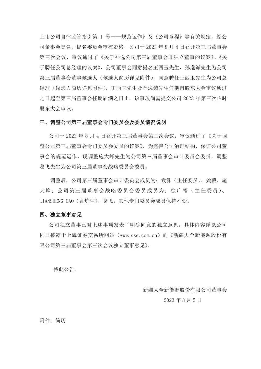 此外,公司董事會同意提名王西玉、孫逸鋮為公司第三屆董事會董事候選人,同意聘任王西玉為公司總經(jīng)理,王西玉及孫逸鋮任期自股東大會審議通過之日起至第三屆董事會任期屆滿之日止。該事項尚需提交公司2023年第三次臨時股東大會審議。