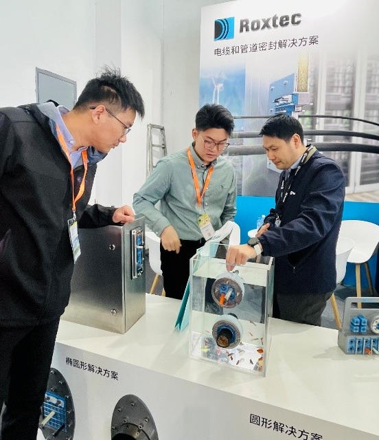 大批風(fēng)電設(shè)備制造商、開發(fā)商及技術(shù)專家蒞臨參觀。國內(nèi)某風(fēng)電整機(jī)廠技術(shù)專家表示:“以往項(xiàng)目中,不同規(guī)格管線要匹配不同密封件,選型、庫存管理都很繁瑣,Roxtec多徑技術(shù)直接解決了這個(gè)痛點(diǎn),對提升安裝效率很有幫助。”