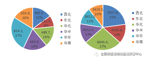 四季度各區(qū)域新增(左)、累計(jì)(右)并網(wǎng)光伏發(fā)電裝機(jī)(萬千瓦)