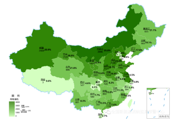 截至2021年底各地區(qū)累計(jì)風(fēng)電裝機(jī)(萬千瓦)及占本地區(qū)總裝機(jī)比重