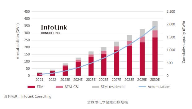 根據(jù)InfoLink資料庫統(tǒng)計,2022年全球電化學儲能新增16.2GW/44GWh,其中以中國新增約34%占整體成長速度最快,其次為美國、歐洲、日本、韓國、澳大利亞等,光是上述國家2022年儲能新增總和占全球超過市場九成份額,因此累計至2022年底,電化學儲能全球累計安裝量為41GW/98.8GWh,之中約有16-17GWh搭配光伏系統(tǒng),InfoLink估計光加儲占比將會因政策及再生能源發(fā)展而逐年提升比重,此外,盡管現(xiàn)在儲能增長速度每年已經(jīng)以倍數(shù)成長,估計到2025年國際電芯廠紛紛擴產(chǎn)之后,儲能系統(tǒng)會因電池價格下降因而再加速建置速度,預計2025年全球電化學儲能市場有望超過100GWh,而2030年全球樂觀有望累積建置 250GWh。