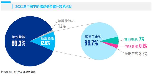 根據(jù)CNESA數(shù)據(jù),2021年中國儲能市場中不同類型儲能方式的占比與全球基本保持一致。其中抽水蓄能仍是最主要的儲能方式,占比86.3%,與全球86.2%的占比持平;但抽水蓄能電站的建設受地形因素限制較大,且建設周期較長,通常需要7年左右,未來隨著電化學儲能等新型儲能造價的下降,抽水蓄能在電力系統(tǒng)中的發(fā)展空間可能受限。新型儲能方式占比12.5%,高于全球0.3個百分點。電化學儲能為最主要的新型儲能方式,占比96.7%,比全球占比略低一個百分點,鋰離子電池占據(jù)主流。