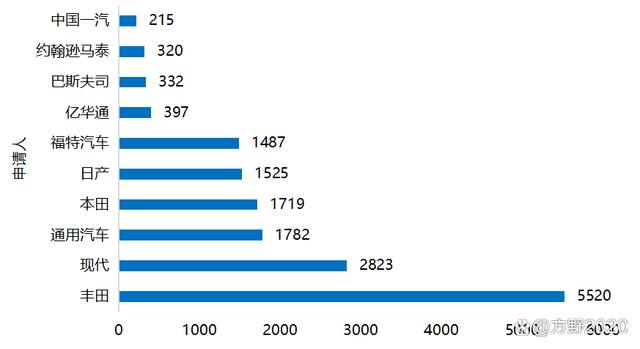 全球車用氫能技術(shù)領(lǐng)域?qū)@暾埩颗琶笆纳暾埲巳鐖D6所示。從圖中可以看到,目前車用氫能技術(shù)主要掌握在眾多車企手中,其中較典型的如日本豐田和本田、韓國現(xiàn)代、美國通用和福特以及中國一汽,而北京億華通作為唯一的非車企型企業(yè)列入其中,具有較佳的研發(fā)實(shí)力。