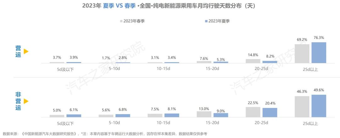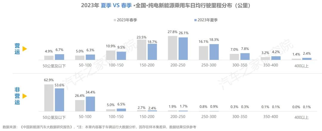 與去年同期相比,純電車輛在行駛里程有所增加,在出行天數(shù)與行駛時長方面,同去年夏季相比大體持平。而從不同車輛性質(zhì)對比上看,營運車輛的使用強(qiáng)度遠(yuǎn)超非營運車輛,兩者在行駛里程方面相差超6倍,在日均時長則亦有近5倍的差距。