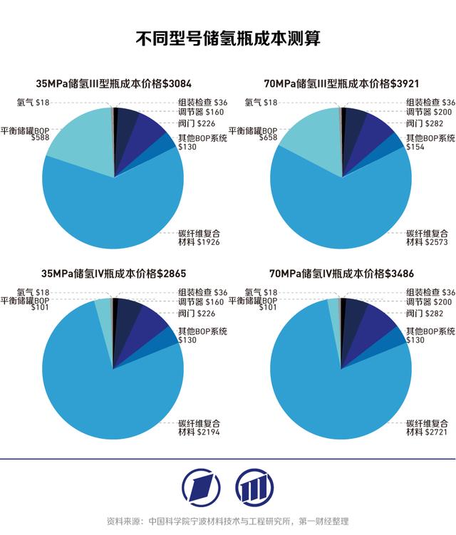 Ⅳ型儲氫瓶不僅性能更優(yōu),成本也低于Ⅲ型儲氫瓶。根據(jù)中國科學(xué)院寧波材料技術(shù)與工程研究所近期的測算,35MPa、70MPa的儲氫Ⅲ型瓶成本價格分別為3084美元、3921美元,而35MPa、70MPa的儲氫Ⅳ型瓶成本價格分別為2865美元和3486美元,分別低7%和11%。