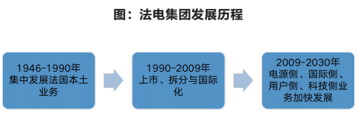 20世紀(jì)40年代,為了戰(zhàn)后重建,法國(guó)政府對(duì)電力行業(yè)實(shí)施國(guó)有化,組建了法電。1946年,法國(guó)將1450家私營(yíng)的發(fā)、輸、配電公司及燃?xì)夤緡?guó)有化,組建成法國(guó)電力公司。在法國(guó)電力工業(yè)發(fā)展初期,法電受政府要求集中力量開展水電、火電、核電、輸電建設(shè),迅速完成了資產(chǎn)、人才、技術(shù)、資源的原始積累。